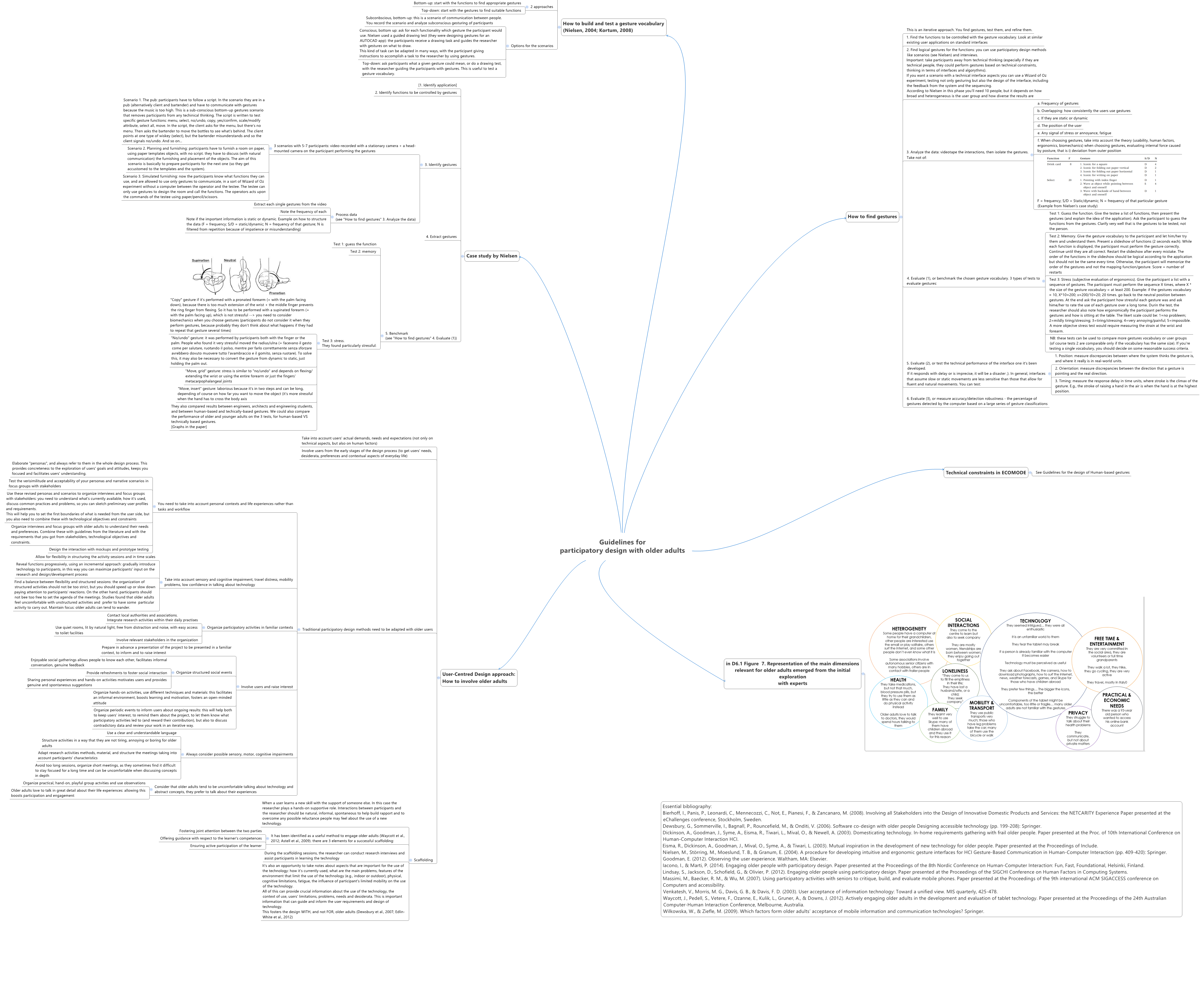 Some time ago I made a literature review on how to involve older adults in participatory design activities, with particular reference to the design on mid-air one hand gestural interaction. I derived a conceptual map from the papers I found mostly relevant, and sometimes I still find it useful for reference, so I share it here: